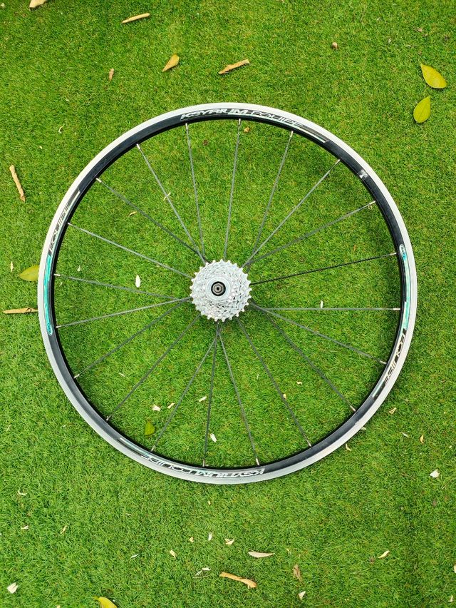 Detalles del productoRueda trasera 700 con Cassette Miche 12/25 9 piñones incluido (compatibilidad campagnolo). Mayormente usada en rodillo, peso aproximado con cassette de 1500gr.