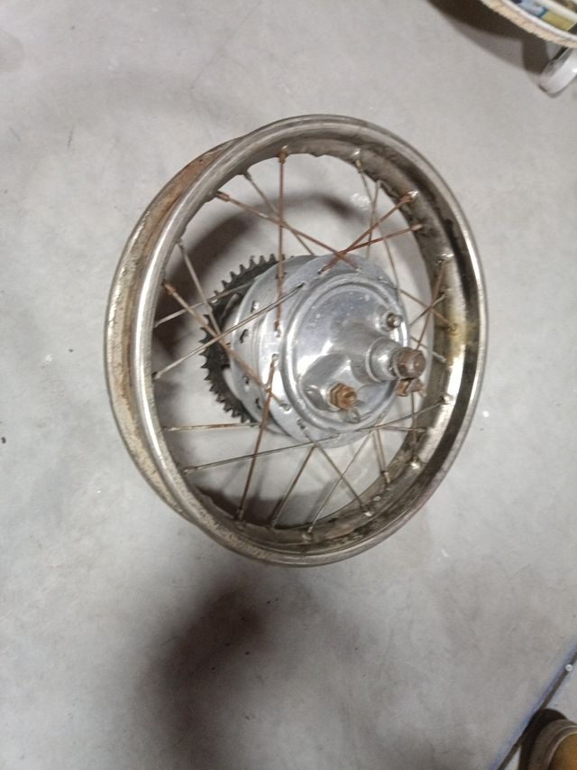 Detalles del productoLlanta completa trasera de MV Augusta 125 TR 4 tiempos aunque válida para otros modelos. Se vende tal cual está, con tensores, plato.. Para restaurar, falta algún radio. Medidas del producto