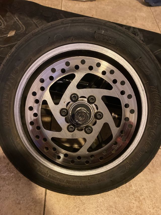 Detalles del productoRueda de patinete eléctrico con llanta y disco de freno.