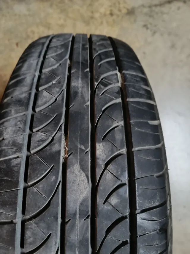 Rueda de coche en buen estado. - Dibujo de la banda de rodadura visible. - Llanta de goma negra.