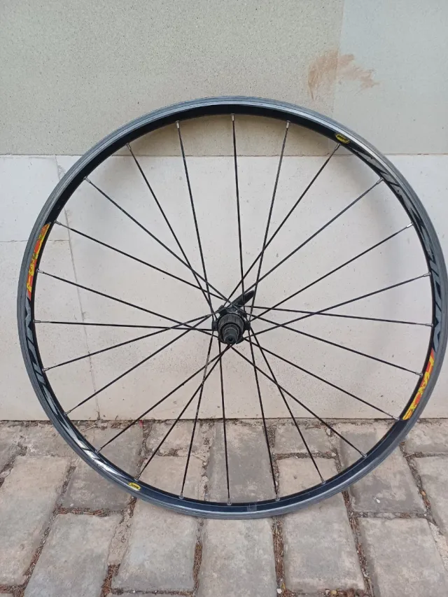 Rueda trasera de bicicleta de la marca Mavic. - Llanta de aluminio. - Radios negros.