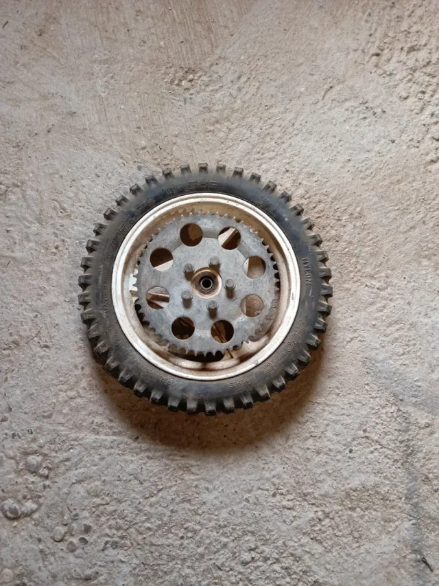 Rueda trasera completa para minimoto, lista para instalar. - Llanta aluminio. - Neumático con buen taco. -le faltan las zapatas de freno
