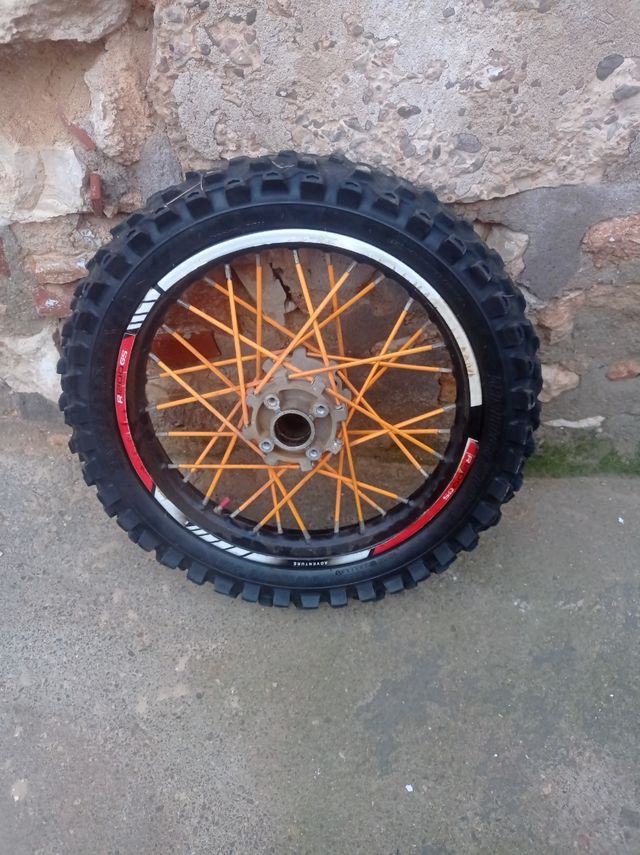 Rueda trasera radio 16 para pit bike con radios de color naranja. - Llanta de color negro. - Neumático de tacos para off-road.