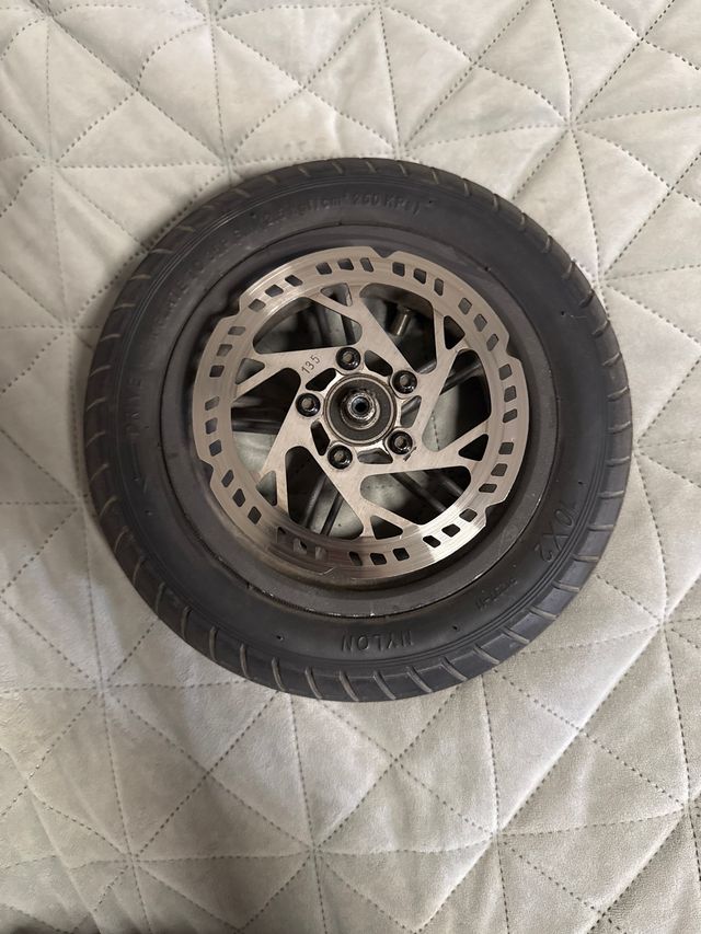 Rueda de repuesto para patinete Xiaomi Pro2. - Disco de freno de 135mm. - Neumático de 10 pulgadas nuevo. - Tornillos con arandela originales.