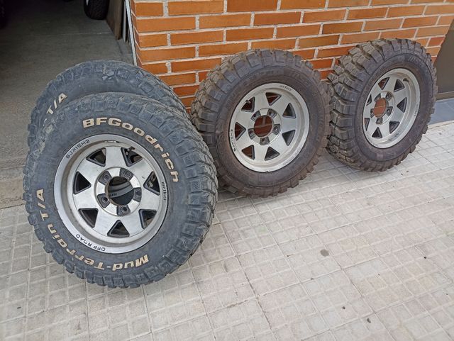 Detalles del productoJuego de 4 ruedas dos BFGoodrich Mud-Terrain en buen estado y dos insa turbo risco prácticamente nuevas, menos de 500 km, con llantas de aluminio, me las quito por cambio de medida