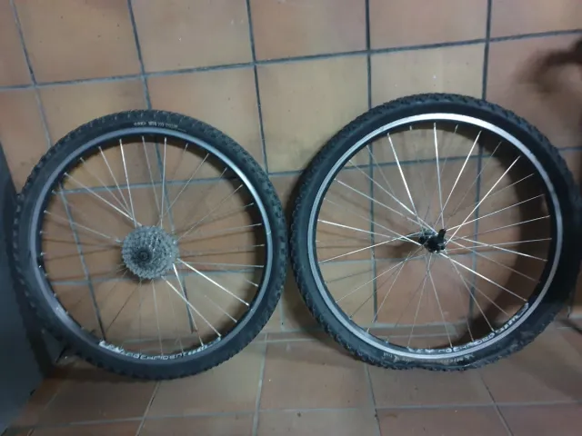 Juego de dos ruedas de bicicleta de aluminio. - Tamaño: 26 pulgadas. - Llantas de aluminio. - Incluye cassette en una de las ruedas.
