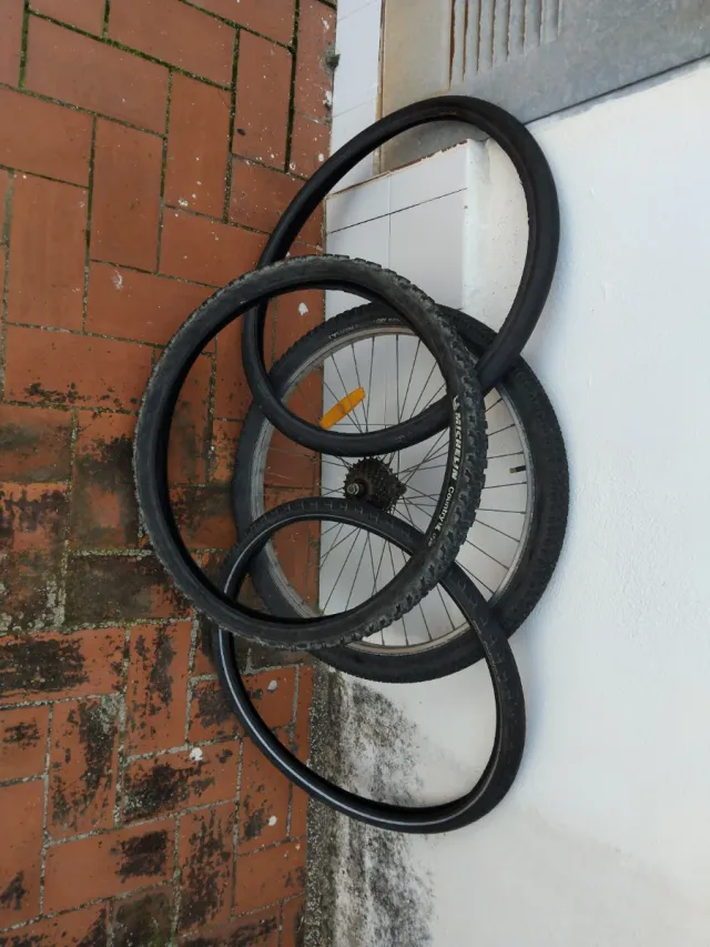 Conjunto de ruedas de bicicleta entrelazadas, ideal para decoración o proyectos artísticos. - Ruedas de goma negra. - Diseño abstracto y moderno.
