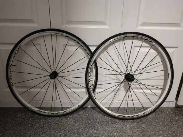 Juego de ruedas de carretera Bontrager con núcleo Shimano. - Llantas blancas. - Radios planos negros.
