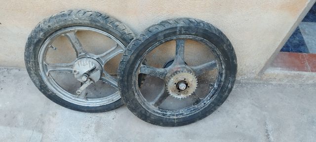 Juego de dos ruedas para Derbi Variant. Ambas ruedas están en buen estado. - Llanta delantera plateada. - Llanta trasera negra con piñón.
