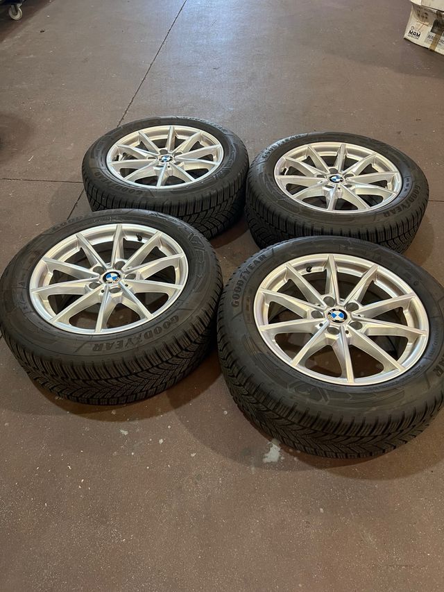 Detalles del productoJuego de 4 ruedas completas para BMW con neumáticos de invierno Goodyear.