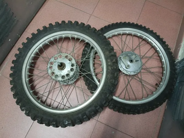 Juego de ruedas para moto de cross. Son de una moto Puch - Llanta delantera. - Llanta trasera con piñón.