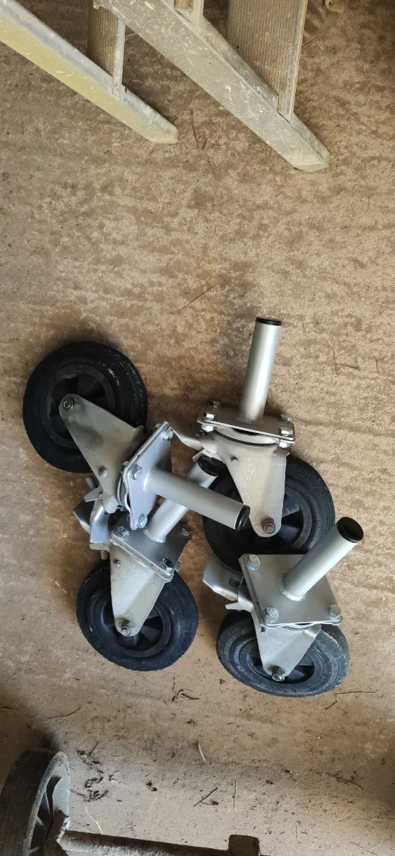 Set de cuatro ruedas para andamio. Fabricadas en metal y goma negra. - Material: Metal y goma. - Color: Plateado y negro. - Cantidad: 4 unidades.