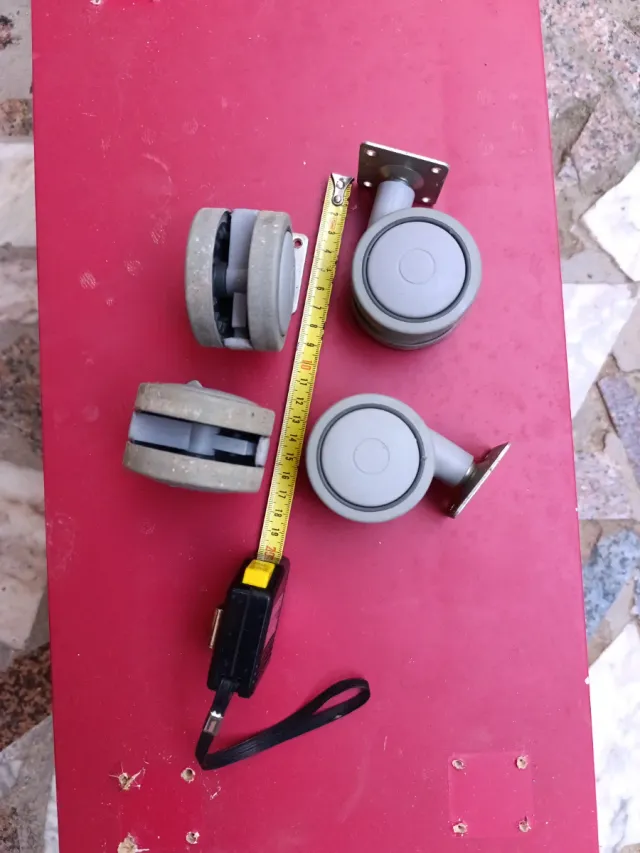 Set de cuatro ruedas para muebles. Son ideales para facilitar el movimiento de mobiliario. - Ruedas de plástico gris. - Base metálica para fijación.