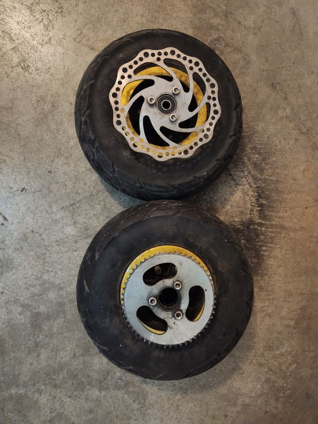 Dos ruedas para patín eléctrico, una con disco de freno y la otra con piñón y disco.