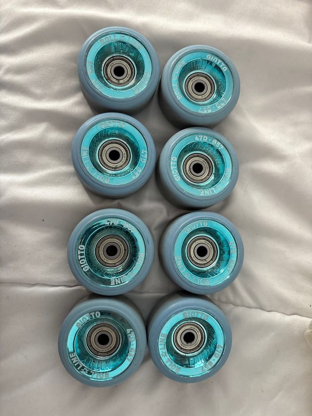 Set de 8 ruedas para patinaje artístico tiene un poco de desgaste - Marca: Roll Line - Modelo: Giotto - Dureza:57 - Color: turquesa - Fabricadas en Italia