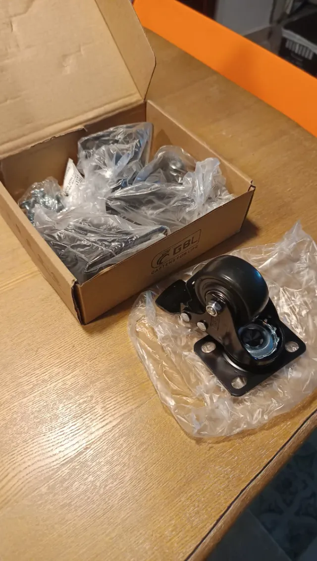 Set de ruedas pequeñas con pedal de freno. - Color negro. - Base cuadrada para montaje. En su caja, sin uso