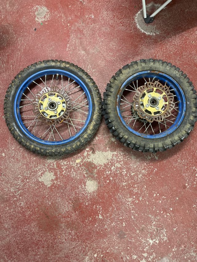 Juego de dos ruedas para pitbike. Listas para montar. - Llantas de color azul. - Radios de metal. - Neumáticos con buen agarre.