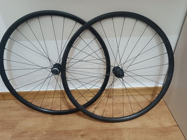 Ruedas procedentes de una Orbea orca. Son de disco y con buje Shimano compatible con cassette de 11 y 12v.