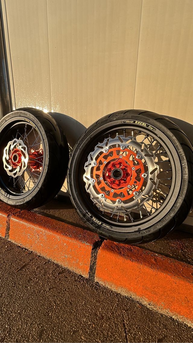 Detalles del productoJuego de ruedas Supermotard con llantas Takasago Excel y neumáticos Michelin.