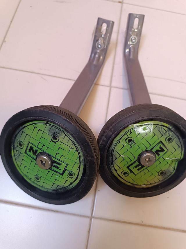 Par de ruedines para bicicleta de niño. Diseñados para dar estabilidad y confianza. - Color verde con diseño. - Soporte metálico gris.