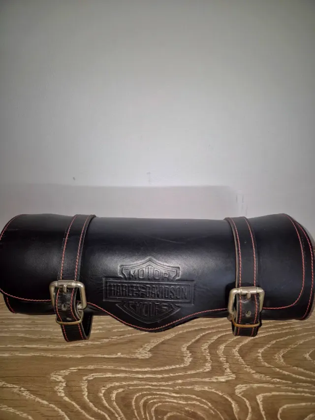 Rulo de herramientas de cuero artesanal con el logo de Harley-Davidson. - Material: Cuero. - Color: Negro. - Costuras en color rojo. - Cierre con hebillas.