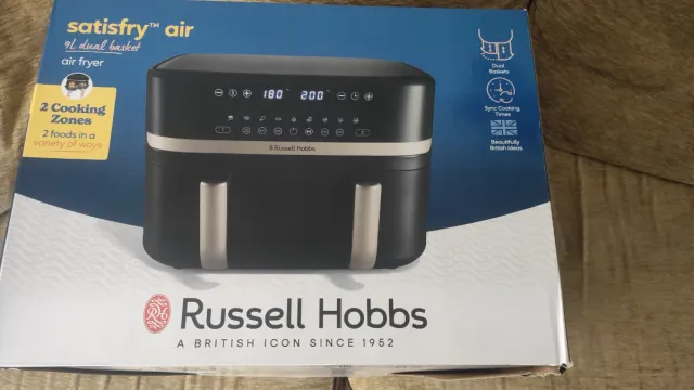 Detalles del productoFreidora de aire Russell Hobbs Satisfry Air con doble cesta de 9 litros. Permite cocinar dos alimentos diferentes a la vez. Nueva en su caja sin abrir