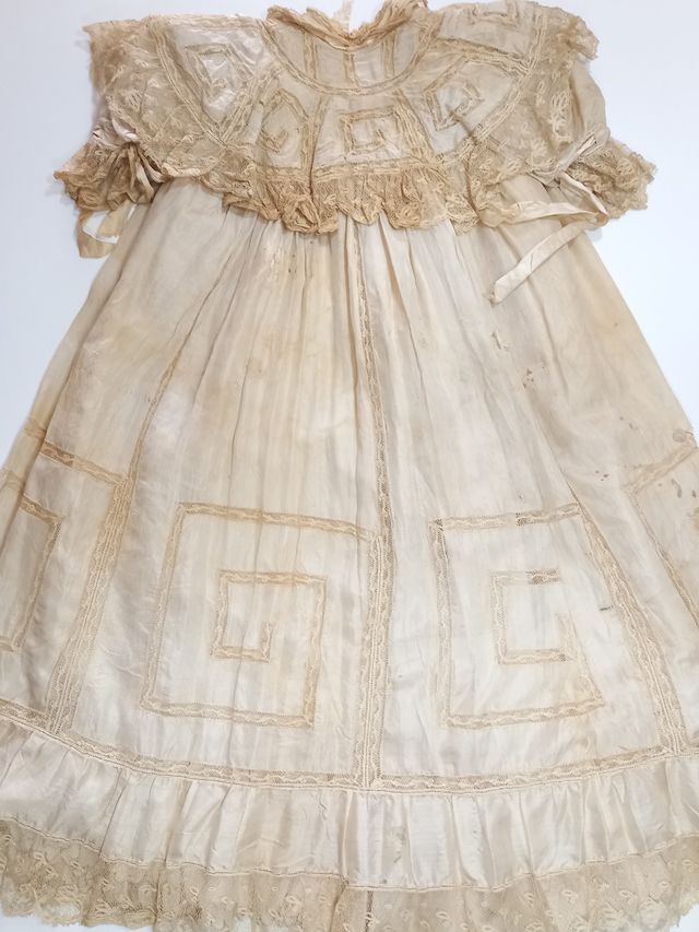Detalles del productoEspectacular faldón bautizo o cristianar muy antiguo, siglo XIX. Confeccionado en seda con bajo faldón también en seda y repleto de encaje de bolillos y lazos de seda. Mide 87 cm de largo.