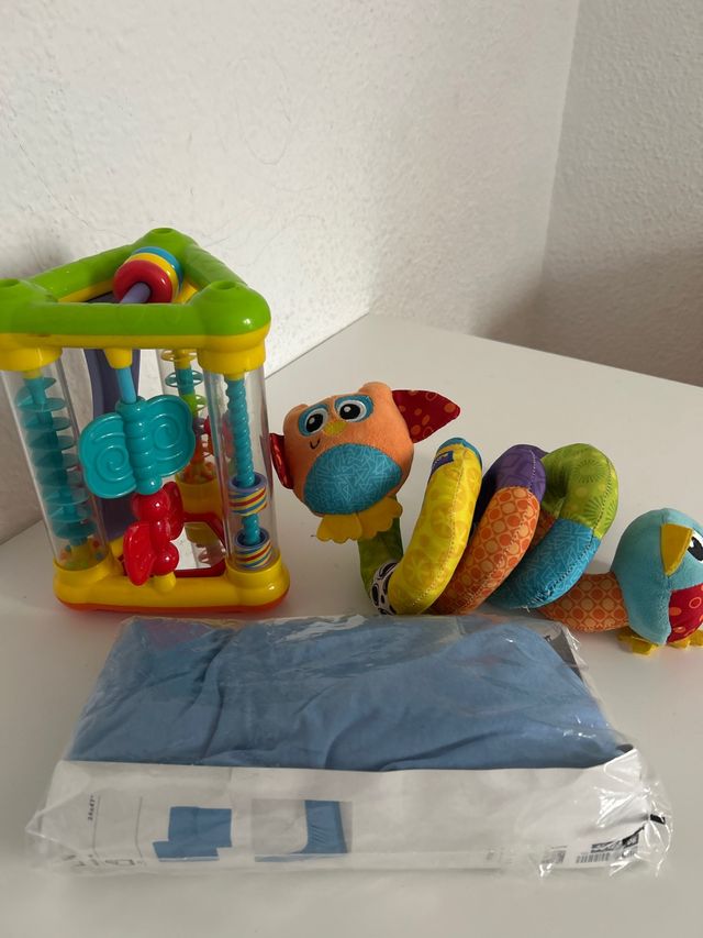 Lote de artículos para bebés. - Sábana para cuna. - Juguete de actividades con forma de oruga. - Juguete de actividades triangular.