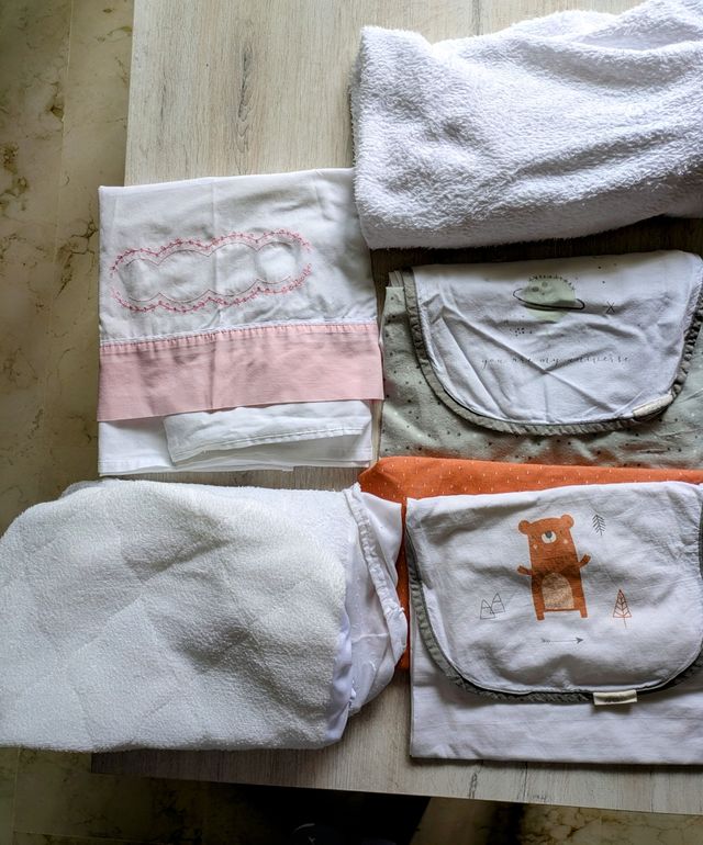 Sábanas capazo. Dos fundas protectoras y juego de cuatro sábanas para el capazo. Bajera y encimera.