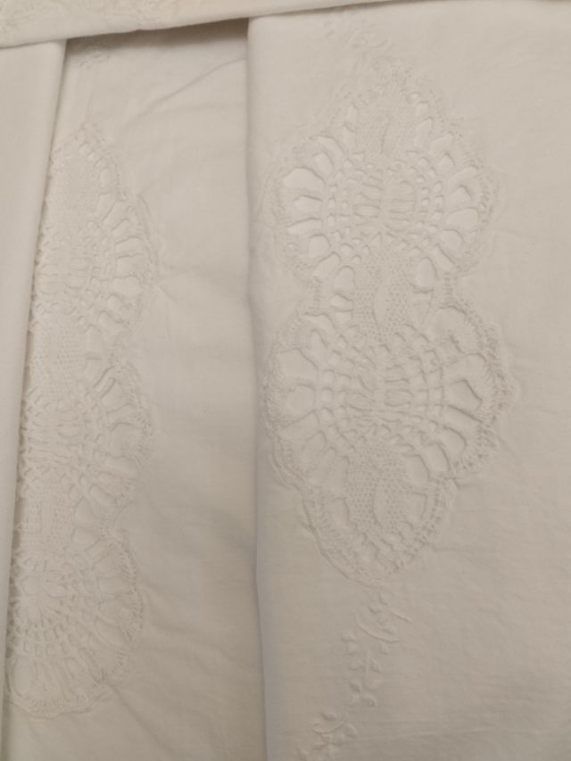 Detalles del productoSábanas muy frescas para el verano, con puntilla y bordado(30€) las almohadas son dos pequeñas hechas a partir de la grande. Aparte también dispongo de dos fundas nuevas(10€) y también tengo la sábana bajera de lienzo(20€). Si compras todo hago descuento.