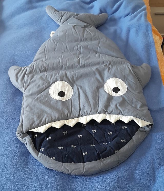 Detalles del productoSaco de bebé para cochecito de la marca Baby Bites Barcelona color azul tiza. Tiene forma de tiburón y en el interior el diseño es de bicis. Sirve tanto para capazo como para silla. Tiene los agujeros para poner el cinturón.