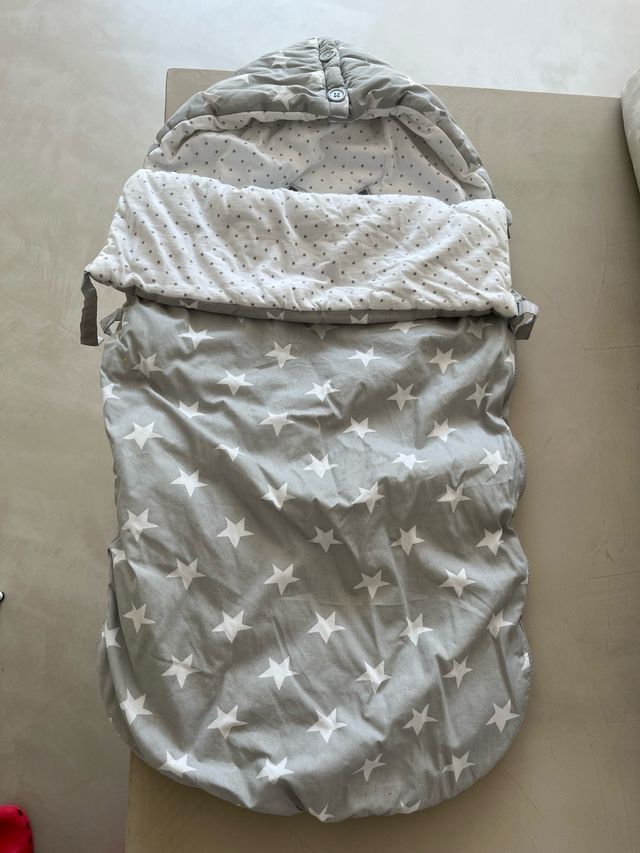 Detalles del productoSaco de dormir para bebé, ideal para mantener a tu pequeño calentito y cómodo. Es de color gris con estampado de estrellas blancas.