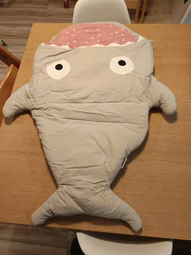Saco de dormir para bebé con diseño de tiburón. - Color gris. - Interior con estampado de puntos rosas. - Ojos grandes y divertidos.