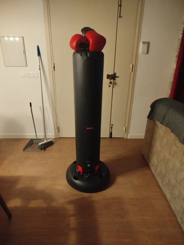Saco de boxeo de pie con base para rellenar de agua o arena. Incluye un par de guantes de boxeo de 14 onzas. - Color negro. - Base redonda. - Guantes rojos.
