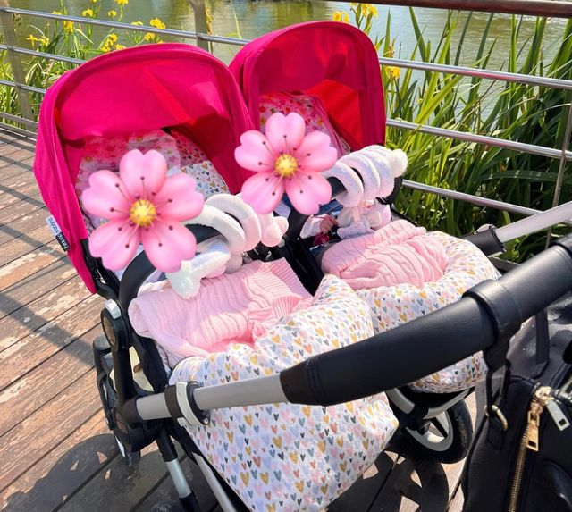 Tela estampada de corazones con interior waffle rosa palo. Puedes poner el saco (es como un mini-nórdico) o quitarlo y dejarlo únicamente con la funda de la silla.