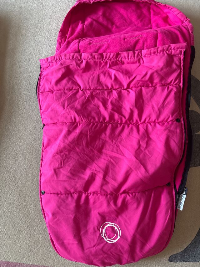 Detalles del productoSaco de invierno Bugaboo para silla de paseo, color rosa fucsia. Está en buen estado, aunque presenta algunas arrugas por el uso.
