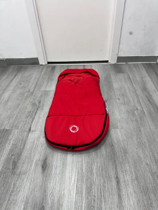 Detalles del productoSaco universal de la marca Bugaboo para cochecito de bebé. Es de color rojo y tiene un diseño acolchado.