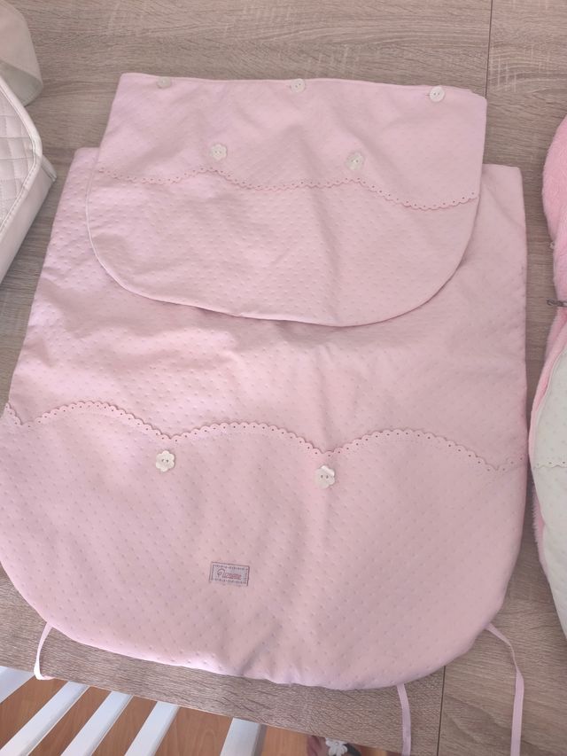Detalles del productoVestidura para carrito de bebé en color rosa. El tejido tiene un relieve de pequeños puntos y está decorado con un borde festoneado y botones florales.