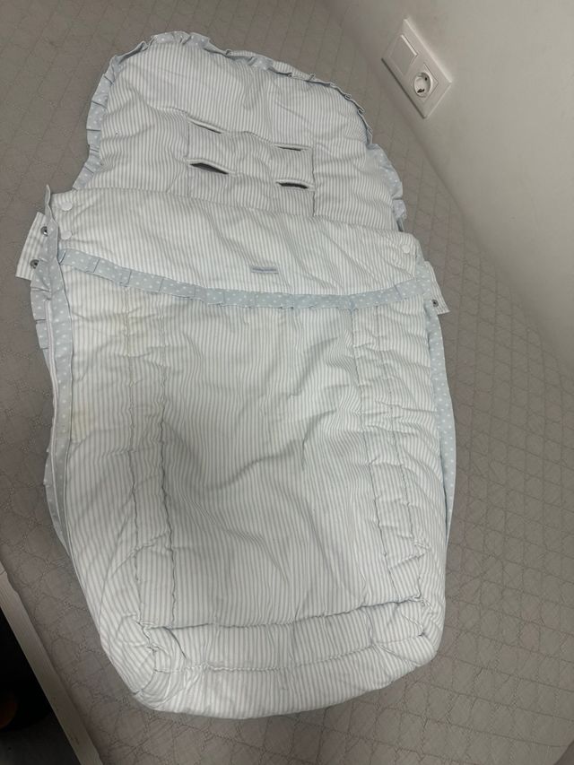 Detalles del productoSaco para silla de paseo de bebé con un diseño de rayas y detalles de puntos.