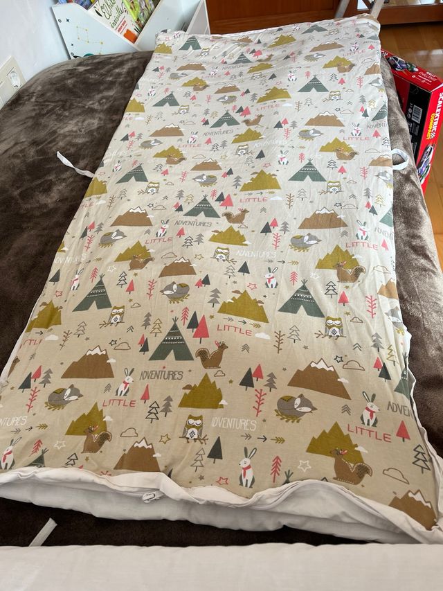 Detalles del productoSaco para cuna con un divertido estampado de animales del bosque y elementos de aventura.
