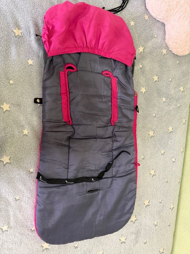Saco para silla de paseo o cochecito de bebé, ideal para mantenerlo abrigado. - Color gris con detalles en fucsia. - Diseño acolchado. - Aberturas para arneses.
