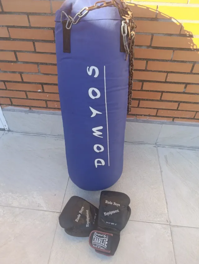 Detalles del productoSe vende saco de boxeo DOMYOS de color azul, con cadena para colgar. Incluye un par de guantes de boxeo negros.