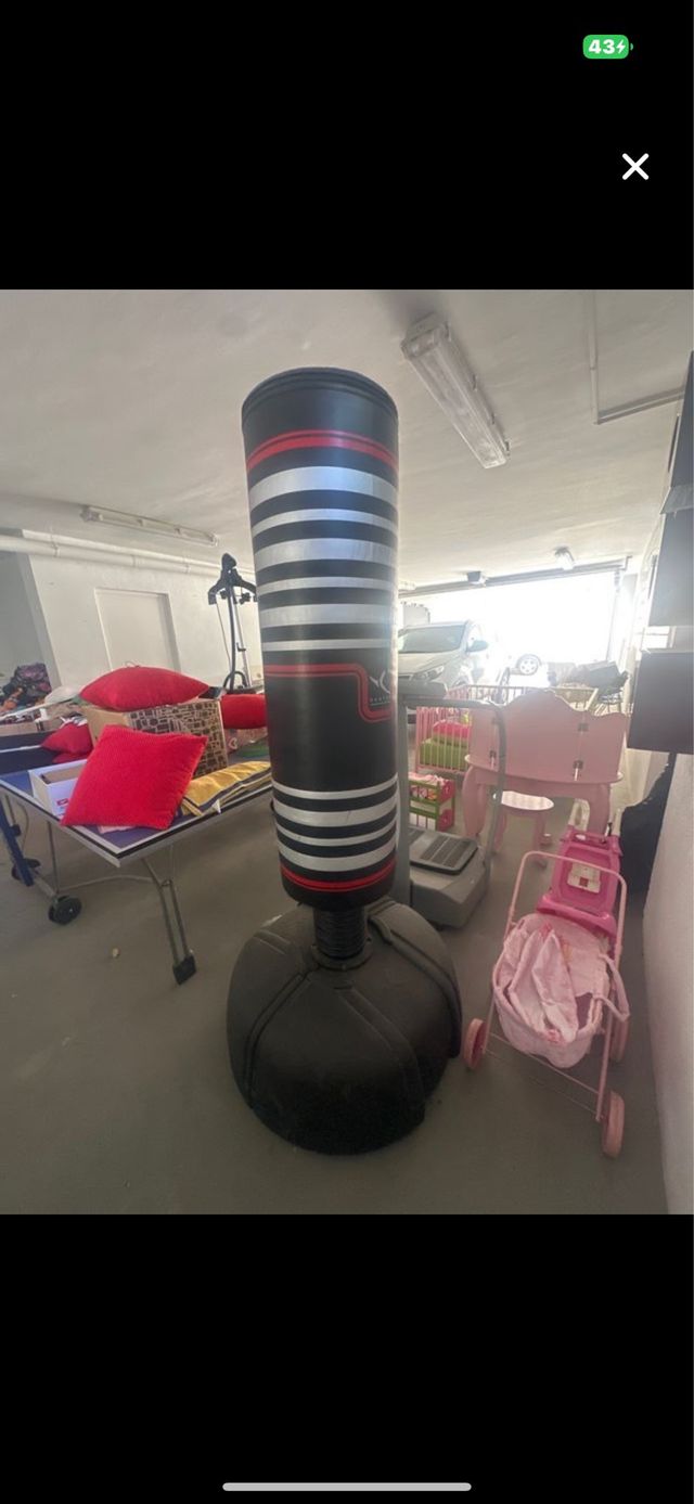 Saco de boxeo de pie, ideal para entrenamiento. - Diseño en negro con detalles plateados y rojos. - Base ancha para mayor estabilidad.