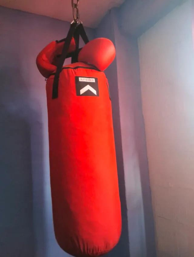 Vendo saco de boxeo, color rojo 20 kilos, con 1 par de guantes. Es comprado en decathlón. En perfecto estado.