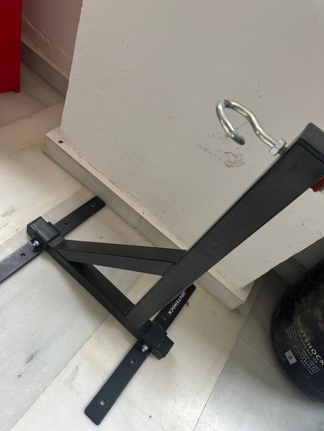 Detalles del productoSoporte metálico negro para saco de boxeo y saco.