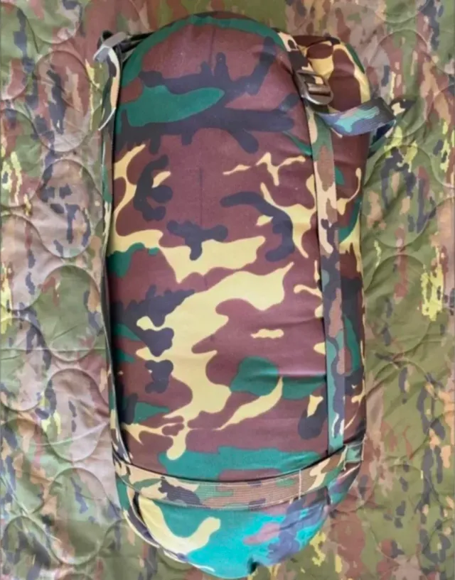 Detalles del productoSaco de dormir con estampado de camuflaje militar, ideal para actividades al aire libre.