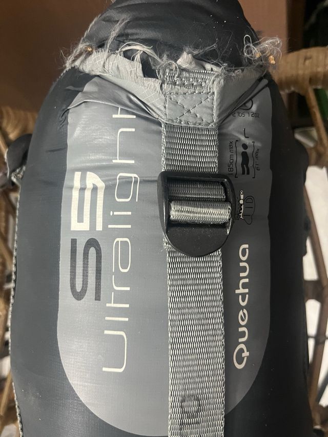 Detalles del productoSaco de dormir Decathlon Quechua Ultralight S5. Bolsa rota como se aprecia en las fotografías, pero saco en perfectas condiciones.