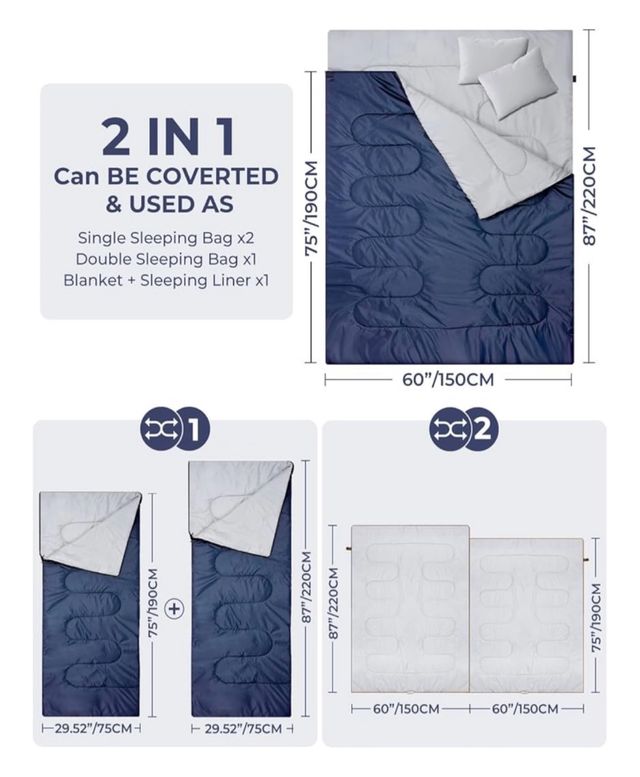 Detalles del productoSaco de dormir doble Ohuhu, ideal para acampar. Es convertible y se puede usar como dos sacos individuales o un saco doble, además de manta y forro.