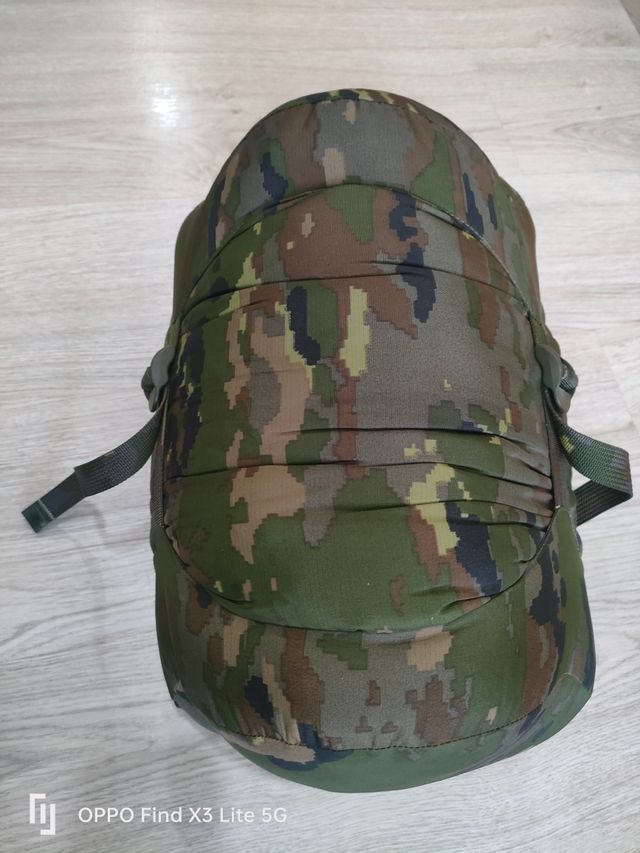 Saco de dormir con camuflaje pixelado del Ejército de Tierra (ET). - Diseño de camuflaje verde. - Cierre con correas ajustables.