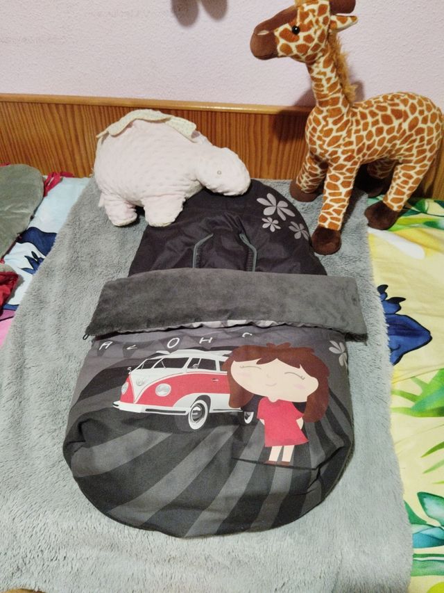 Saco para silla Grupo 0 con un divertido diseño. - Estampado de furgoneta y niña. - Tonos grises y rojos. - Material suave y confortable.